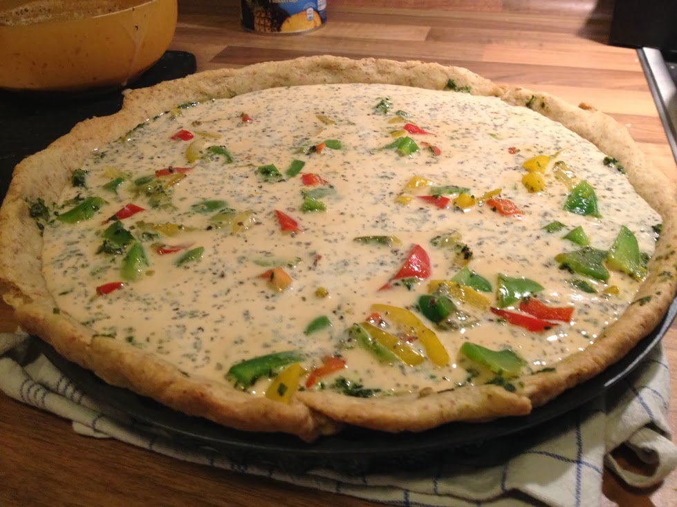 5. Na podpieczoną tartę wykładamy szpinak, posypujemy odrobiną sera (niekoniecznie), wrzucamy pokrojoną paprykę i całość zalewamy sosem. Ponownie posypujemy serem i wkładamy do nagrzanego piekarnika. Pieczemy w 180 stopniach do momentu aż wierzch będzie zrumieniony a masa ścięta ( około 20, 25 minut) ale najlepiej sprawdzić podczas pieczenia.